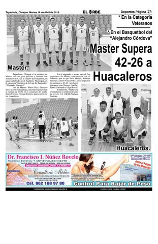 Master. Tapachula, Chiapas.- La quinteta de Master dio un gran partido y derrotó con marcador de 42-26 al cuadro de Huacaleros, en juego celebrado en el Auditorio Municipal, en la categoría Veteranos de la Liga de Basquetbol “Alejandro Córdova”. Los de Master: Mario Díaz, Gustavo Sacre y José Incháustegui, encestaron para tomar la ventaja de 14-11 en el comienzo del duelo. Jaime Corzo y Enrique Romero aparecieron por los Huacaleros.