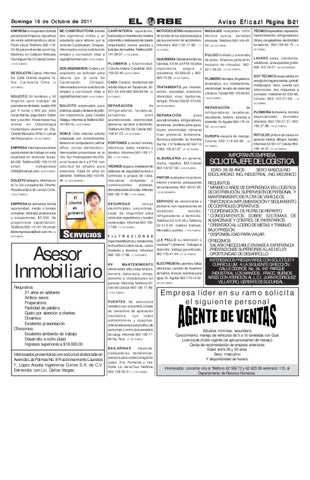 Aviso Eficaz! Página BB-21 -21 CARPINTERÍA reparación, barnizado en muebles de madera a domicilio y elaboración de closets empotrados, cocina, puertas y todo tipo de muebles. Teléfono 962141-29-07. (17 OCTUBRE). PLOMERÍA y Electricidad. Colonia Indeco Cebadilla. 962136-05-46 (30 OCTUBRE).