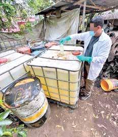 cinco contenedores de plástico con capacidad de mil litros que contenían cuatro mil litros de un líquido de color amarillo traslúcido, con las características del hidrocarburo; además, 27 tambos con capacidad de 200 litros que contenían cuatro mil 860 litros de hidrocarburo; todo lo anterior sumó un total aproximado de ocho mil 860 litros, de, al parecer, diesel automotriz.