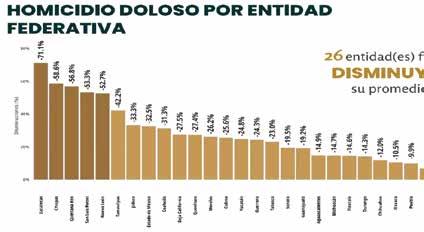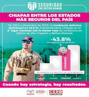y de la coordinación interinstitucional. En materia de delitos de alto impacto, Chiapas registró una reducción significativa del 62.8 por ciento en comparación con 2024, posicionándose entre los estados con mayor disminución a nivel nacional. Asimismo, la tasa estatal pasó de 41.97 en 2024 a 23.6 en 2025, muy por debajo de la media nacional, que se ubicó en 229.47.