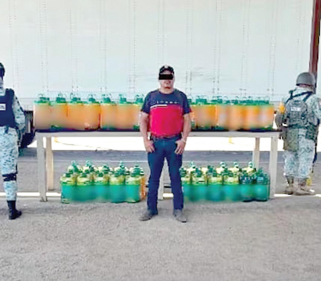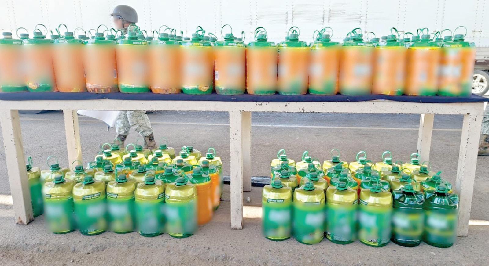de esta fuerza de seguridad pública, en coordinación con el Ejército Mexicano, le hicieron la parada total al conductor de un tráiler. Durante la revisión localizaron dentro del vehículo 118 galones con aproximadamente mil 062 litros de metanfetamina líquida, la cual pretendía hacer pasar por limpiador multiusos, por lo que detuvieron al chofer. La carga venía procedente de San Luis