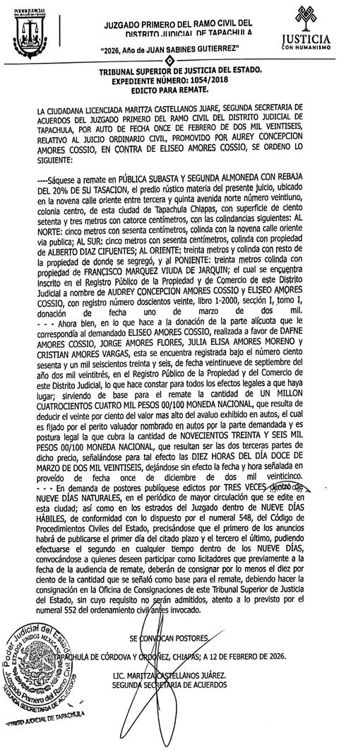 Tapachula, Chiapas; 18 de febrero de 2026.- Por acuerdo de la Mesa de Paz que encabeza el
