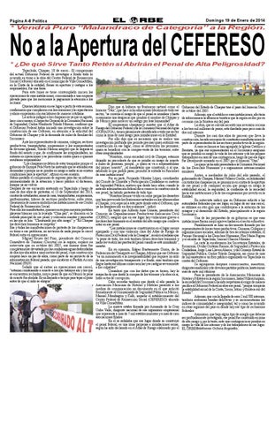 * ¿De qué Sirve Tanto Retén si Abrirán el Penal de Alta Peligrosidad? Tapachula, Chiapas; 18 de enero.- El compromiso del actual Gobierno Federal de investigar a fondo todo lo ocurrido en torno a la obra del Centro Federal de Reinserción Social (Cefereso) ubicado en el municipio de Villa Comaltitlán, en la Costa de la entidad, frenar su apertura y castigar a los responsables, fue una farsa. Para éste lunes se tiene contemplado inicien las operaciones de esas instalaciones, concesionada a una empresa privada para que los mexicanos le paguemos la atención a los reclusos. Quienes laborarán en ese lugar a partir de ésta semana, conÞrmaron que cumplieron con los exámenes y la capacitación y ahora empezarán con sus labores de manera cotidiana. La noticia indignó a los chiapanecos ya que en agosto, hace cinco meses, el Inspector General de la Comisión Nacional de Seguridad, Carlos Humberto Toledo Moreno, conÞrmó que el Gobierno Federal había iniciado una investigación sobre la construcción de ese Cefereso, en atención a la solicitud del Gobierno de Chiapas y de la demanda de miles de familias del Soconusco. Ante los representantes de cámaras, colegios, sectores productivos, transportistas, empresarios y los representantes de diversas iglesias, Toledo Moreno aseguró que se llegaría al fondo del asunto y que, de conÞrmarse las irregularidades, no entraría en operaciones y se procedería contra quien o quienes resultaran responsables. “Los chiapanecos deben de estar tranquilos porque el gobierno de Enrique Pela Nieto ha instruido que se atiendan sus demandas y porque no se pondrá en riesgo a nadie si no existen condiciones para la apertura”, aÞrmó en esa ocasión. Había quedado el compromiso de regresar para dar un informe pormenorizado de la situación y hacer público el dictamen, aunque ya no volvió. Después de ese encuentro sostenido en Tapachula y luego de más de dos años de protestas, el 13 de Septiembre del 2013, cientos de estudiantes, amas de casa, transportistas, empresarios, profesionistas, líderes de sectores productivos, entre otros, clausuraron de manera simbólica las instalaciones de ese Centro Federal de Reinserción Social. Para ello los manifestantes, quienes en su gran mayoría portaban playeras blancas con la leyenda “Chia-paz”, se ubicaron en la entrada principal de ese penal y colocaron mantas y pancartas en las que se leía: “Clausurado por alto riesgo” y “En Chiapas los derechos humanos se respetan”. Esa y todas las manifestaciones de protesta de los chiapanecos en torno a ese problema, no sirvieron de nada porque la cárcel federal entra en operaciones. Miguel Reyes del Pino, presidente del Concejo Consultivo de Turismo (Cocotur) en la región, explicó en entrevista que en octubre del 2005, esa misma zona fue completamente devastada por las caudalosas aguas desbordadas de dos ríos ubicados a unos metros del penal, cuya construcción empezó hace un par de años, como parte de un proyecto de la administración federal pasada, que encabezó el Partido Acción Nacional (PAN). Señaló que al entrar en operaciones esa cárcel, “estarían condenando a muerte a los que trabajen ahí y los que se encuentren recluidos, muy a pesar de que en México la pena de muerte fue abolida. Es un llamado a tiempo para tapar el pozo antes de que el niño se ahogue”.
