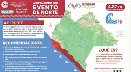 Tuxtla Gutiérrez, Chiapas; 19 de Enero de 2026.- El Sistema Estatal de Protección Civil informa que derivado de los efectos del frente frío número 29, en Chiapas se mantendrá la masa de aire polar que podría generar vientos con rachas de 70 a 90 kilómetros por hora en la región Istmo Costa.