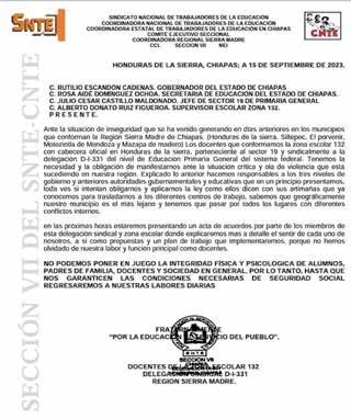Tapachula, Chiapas; 19 de Septiembre del 2023.- La Coordinadora Nacional de los Trabajadores de la Educación (CNTE) anunció este martes que no regresarán a clases presenciales en varios municipios de Chiapas, por los altos niveles de inseguridad y violencia que aseguran están viviendo.