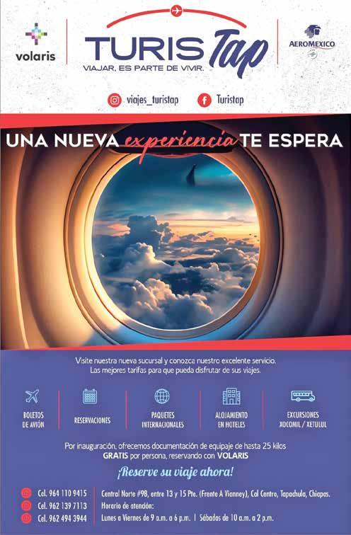 VIAJES MATRIZ: 4ª AV NORTE #18 TEL 96262 50600 SUC. CENTRO: 1ª PONIENTE #7 ( FRENTE TELMEX ) 96262 53582 PLAZA HUACALES: 4ª AV NORTE Y SENDERO PEATONAL 962 118 2545 VUELOS SALIENDO DE TAPACHULA TAP/MEX DOMINGO A VIERNES 3 VUELOS SALE 09:15 AM – LLEGA 11:10 AM SALE 03:40 PM – LLEGA 05:40 PM SALE 07:55 PM - LLEGA 09:55 PM SABADO 2 VUELOS SALE 09:15 AM – LLEGA 11:10 AM SALE 03:30 PM – LLEGA 05:30 PM TAP/MEX VUELO NOCTURNO LUNES A DOMINGO SALE 09:19 PM – LLEGA 11:05 PM LUNES Y JUEVES VUELO MATUTINO SALE 08:14 AM – LLEGA 10:00 AM TAP/GUADALAJARA 3 VUELOS DIRECTOS
