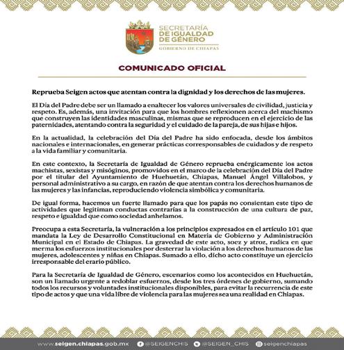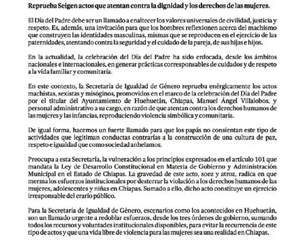 Integrantes del Colectivo 50+1 capítulo Chiapas condenaron “enérgicamente el evento del Día del Padre, auspiciado por el ayuntamiento de Huehuetán”, en poder del Partido Verde Ecologista de México (PVEM), donde “se ofreciera un espectáculo de bailarinas con poses y bailes sexuales sugerentes”. “El Día del Padre fue concebido para resaltar la importancia de la figura paterna en la vida de las personas, destacando su rol en la integración y el mantenimiento del núcleo familiar. Por ello, es lamentable que