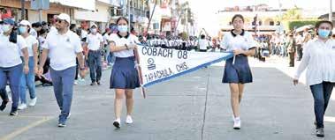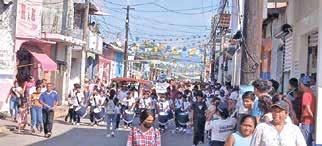 Los festejos comenzaron en el Barrio La Cueva, donde alumnos, maestros, autoridades y pobladores marcharon por la carretera que conduce a ese lugar fronterizo con Guatemala. El contingente aprovechó el