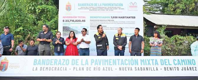 En Maravilla Tenejapa, el gobernador Eduardo Ramírez Aguilar supervisó la pavimentación con concreto mixto del camino La Democracia–Plan de Río Azul–Nueva Sabanilla–Benito Juárez, en el tramo del km 0+000 al km 30+800, específicamente en el subtramo del km 0+000 al km 2+200, obra que representó una inversión de 25 millones de pesos. Asimismo, dio inicio a la continuación de los trabajos en el subtramo del km 2+200 al km 4+200, que contempla una inversión superior a 23.7 millones de pesos.