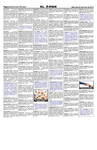Página BB-22 -22 Aviso Eficaz! SOLICITO encargado, requisitos: experiencia en puesto similar, de 30 a 40 años de edad. Presentarse con solicitud de empleo requisitada en Central Norte No.56 altos casi esquina 7a. Poniente, con Ramón López, los días 22, 23, 24 Enero de 10:00 a 13:00 horas. (24 ENERO). SOLICITO empleada de mostrador, sexo femenino, soltera, responsable, buen trato a clientes, disponibilidad de horario. Presentarse con solicitud de empleo en 7a. Poniente No.27-A entre 10a. y 12a. Avenida Norte, Mercería Clarita. (24 ENERO). SOLICITO secretaria administrativa, requisitos: manejo de paquetería, de 18 a 25 años de edad, experiencia no necesaria. Presentarse con solicitud de empleo requisitada en Central Norte No.56 altos casi esquina 7a. Poniente, con Ramón López, los días 22, 23, 24 Enero de 10:00 a 13:00 horas. (24 ENERO). ¿TE GUSTAN las redes de mercadeo o multinivel? ¿buscas un buen plan de compensación? Immunotec tiene lo que buscas. 962-121-33-14, 962-141-97-19.