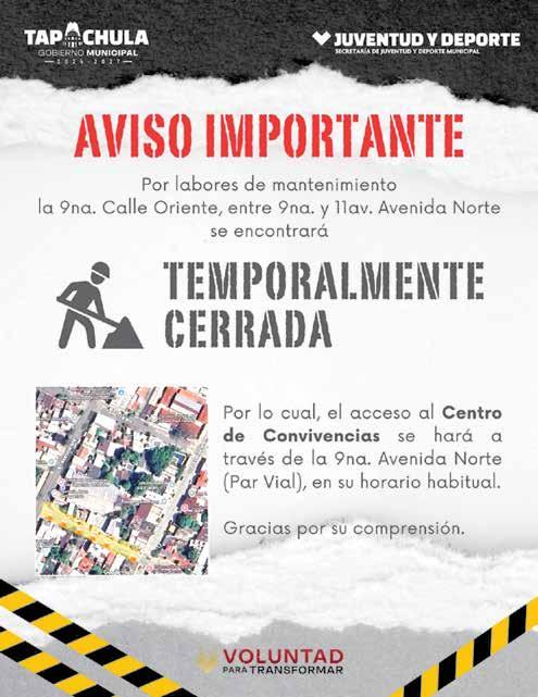 El Ayuntamiento de Tapachula a través de la Secretaría de Obras Públicas informa a la ciudadanía n general que debido a trabajos de mantenimiento la 9a. calle Oriente entre 9a. y 11a. avenida Norte, PERMANECERÁ CERRADA TEMPORALMENTE.