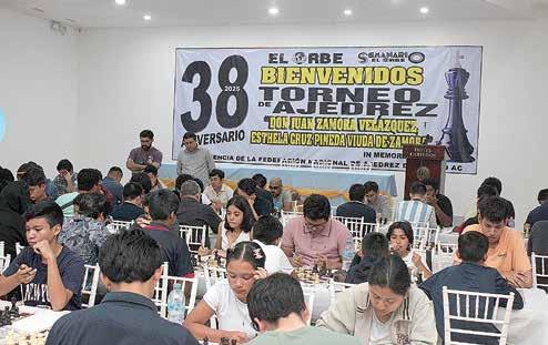 Tapachula, Chiapas; 22 de Noviembre del 2025.- Participantes de la 38 edición del Torneo de Ajedrez EL ORBE, en memoria de Don Juan Zamora Velázquez y Esthela Cruz Pineda Viuda de Zamora, continuaron este sábado por la mañana y tarde, con emocionantes encuentros del deporte ciencia en el salón de eventos del hotel Cabildos.