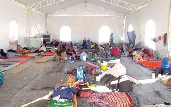 El refugio temporal está dividido en tres secciones: hombres, mujeres, y núcleos familiares, en los cuales el INM colocó baños, paquetes de higiene personal, colchonetas y mantas térmicas, así como áreas para consumir tres alimentos diarios y agua potable.
