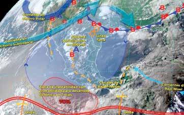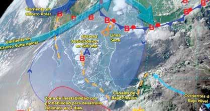 Por otro lado, una línea seca y un canal de baja presión se extenderán sobre la Mesa del Norte, mientras que la corriente en chorro subtropical atravesará el noroeste mexicano, propiciarán chubascos y lluvias puntuales fuertes acompañadas
