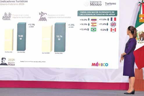 En febrero de 2026 se registró un récord histórico en los últimos 20 años con la llegada de 3.88 millones de turistas internacionales, mientras que la llegada de visitantes internacionales alcanzó 8 millones; la derrama económica también registró un hito en los últimos 20 años con más de 3 mil 268 mdd, es decir 14 mdd más que el año pasado, abundó. Rodríguez Zamora señaló que en el periodo vacacional de Semana Santa llegaron 7.82 millones de visitantes, lo que es un crecimiento de 4.1 por ciento respecto a 2025; la llegada de turistas registró 3.75 millones de personas, un aumento de 4.2 por ciento y la derrama económica fue de 30 mil 740 millones de pesos (mdp), es decir 5.3 por ciento más. La ocupación hotelera fue del 74 por ciento; se transportaron en el Tren Maya más de 10 mil pasajeros en dos días y más de 2.2 millones de personas presenciaron la Pasión de Cristo en Iztapalapa, lo que establece un nuevo récord. Boletín Oficial.
