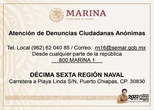 Número 11510 Año XXXVII Tapachula de Córdova y Ordóñez, ChiapasFundador y Director General: C.P. ENRIQUE ZAMORA CRUZ email: el_orbe@hotmail.comemail: elorbe@prodigy.net.mx @periodicoelorbe @ElOrbe_ Periodico El Orbe www.elorbe.com.mx Certificado de Licitud de Título y Contenido N° 17230. Expediente CCPRI/TC/18/21135 Auditado por El de Mayor Circulación en Chiapas EL ORBE VALE 7 PESOS Lunes 26 de Septiembre de 2022 Ver Pág. 26Detienen a Dueño de la Mina “El Pinabete” en Coahuila *Donde Permanecen Atrapados 10 Trabajadores. Ver Pág. 8Coparmex Solicita a la Oposición Controversia por Militarización *Piden Definir una Mejor Estrategia de Seguridad.Ver Pág. 28Marchan en Contra de la Violencia en el País *Diversos Colectivos y Activistas. Ver Pág. 8 Ver Pág. 8 Se Reúne Diputado Luis Armando Melgar con Sectores Productivos de CopainaláRealiza Eduardo Ramírez Intensa Gira de Trabajo por la “Perla del Soconusco” *Sostiene Encuentros con Sectores y Atiende Solicitudes. *Afirma que Debe ser Considerado “Pueblo Mágico”. Inicia Obra de la Clínica Para la Atención de Parto Humanizado de Tapachula: REC Ver Pág. 2 Ver Pág. 26Chiapas Registra 17 Contagios Nuevos de COVID-19 en las Últimas Horas Ver Pág. 26*Tuxtla 9, Tapachula 4, No Bajemos la Guardia. SSA Realiza Actividades en 26 Municipios Para Prevenir Embarazos en Adolescentes *En el Marco de la Campaña “Planea con Amor”. Migrantes y Pastoral de Refugiados Realizan Procesión en Tapachula Atiende el Banco de Alimentos a Más de 4 Mil 500 Familias de Escasos Recursos *En 51 Comunidades de 10 Municipios de la Región. *Participan en Misa Encabezada por el Obispo. Se Desploma Demanda del Transporte Hacia la Frontera Norte del País Fallece en Accidente Cantante de Los Nuevos Cadetes, Lupe Tijerina *Debido a Restricciones Migratorias. *El Percance Ocurrió Cuando se Dirigía a su Casa. Ver Pág. 27 Ver Pág. 26 Ver Pág. 7 Ver Pág. 28 Toma Protesta Nueva Gobernadora de Quintana Roo Ver Pág. 7 Ver Pág. 25 Realiza CECyTECH Encuentro Estatal Deportivo Juvenil Migrantes Deportados Intentan Pasar en Caravanas por Chiapas *Toman Como Ruta la Carretera Costera. Ver Pág. 27 Parte de Tapachula la Caravana Número 24; Ingresa Grupo de Migrantes y se Instala en el Parque Central Ver Pág. 27 Ayuntamiento de Tapachula Conmemora el Día Mundial del Turismo Suspenden Clases en la Federal No. 1, Investigan Intoxicación de Alumnos Poder Judicial y Sociedad Civil se Suman al Apoyo de los Grupos Vulnerables Ver Pág. 2 Ver Pág. 3 Ver Pág. 7*Con Actividades Artístico-Culturales. Esta Edición Consta de 32 Páginas *#FueraElTata Faltan 57 DíasMientras la Selección Sufre Para Ganar, “Chicharito” Sigue Haciendo Goles *Participan 306 Alumnos.*Autoridades Aplican Protocolos Para Desinfectar la Escuela. *Este Lunes Serán Atendidos Mil Extranjeros en Oficinas de Regulación Migratoria. *Asume el Cargo Mara Lezama. *Entregan Kits de Ayuda a Reclusas en SCLC. *El Mandatario Anunció la Reconversión del Centro de Salud de Santa Clara. *EL GOBERNADOR ENCABEZÓ LA COLOCACIÓN DE LA PRIMERA PIEDRA DE TAN IMPORTANTE CLÍNICA, ADEMÁS DE SUPERVISAR LA INFRAESTRUCTURA QUE SE CONSTRUYE.