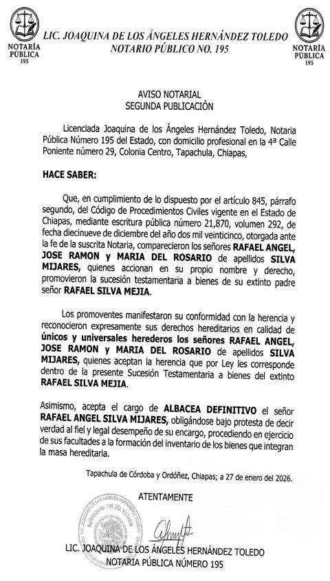 “N”, fueron detenidos por el homicidio calificado del Secretario del Comisariado Ejidal de Tila, Julio “N”, ocurrido el pasado 12 de enero, en el tramo carretero de Nicolás Bravo, donde se encontró el cuerpo. Asimismo, Héctor “N” y Eugenio “N” fueron detenidos por el homicidio calificado del ex Comisariado General de Tila, José “N”, acontecido el 10 de septiembre de 2025, en el camino de vereda entre Chulum Chico y Río Grande. Al finalizar la transmisión, Jorge Llaven anunció la convocatoria de 50 plazas para pertenecer a la Agencia de Investigación e Inteligencia Ministerial, y agregó que en el transcurso de la semana se dará a conocer la convocatoria para otros espacios. Boletín Oficial