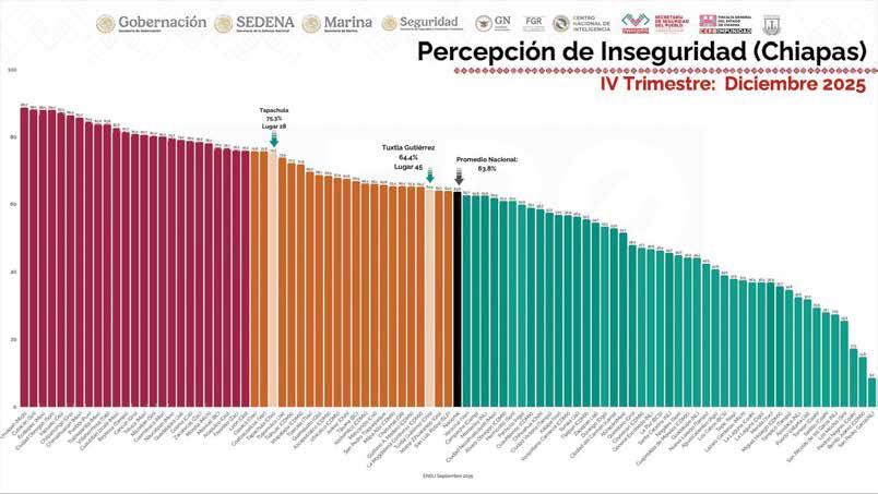Llaven Abarca aclaró que esta encuesta se refiere a cómo se sienten las personas en el lugar en donde viven y la confianza respecto al trabajo de las autoridades de seguridad, y en el caso de Tuxtla Gutiérrez se encuentra en el lugar número 45, mientras que Tapachula, que estaba dentro de las ciudades con mayor percepción de inseguridad, pasó al número 28.