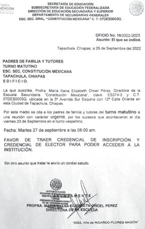 La directora de la Escuela Secundaria “Constitución Mexicana” (Federal No. 1), Elizabeth Choel Pérez, convocó este día a los padres de familia de esa institución educativa a una reunión con carácter de urgencia, para tratar el tema de los más de 30 alumnos intoxicados el fin de semana, por causas que aún se desconocen.