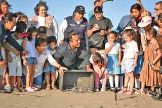 Acompañaron al gobernador la señora Sofía Espinoza Abarca; su hija Grecia Ramírez Espinoza; así como las secretarias de Medio Ambiente e Historia Natural, Obdulia Magdalena Torres Abarca, y de Pesca y Acuacultura, Judith Torres Vera; entre otras y otros asistentes. *Eduardo Ramírez encabeza liberación de tortugas marinas en Puerto Arista*