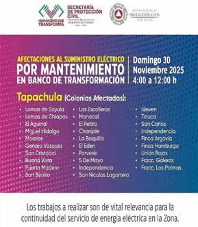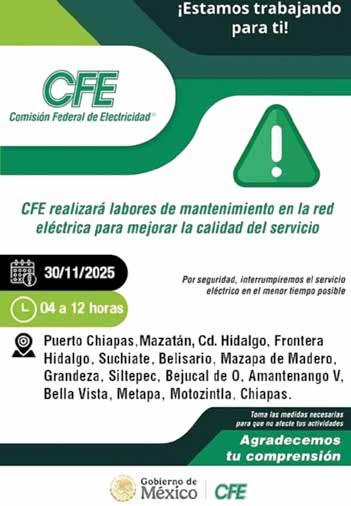 Tapachula, Chiapas; 29 de Noviembre de 2025.- Miles de usuarios de distintos municipios de Chiapas, principalmente de la región Costa y Sierra, se verán afectados hoy domingo 30 de noviembre debido a la suspensión programada del suministro eléctrico. La Comisión Federal de Electricidad (CFE)
