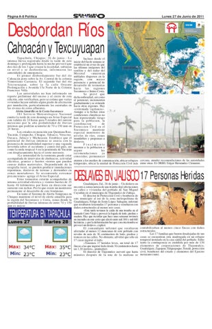 Desbordan Ríos Cahoacán y Texcuyuapan Tapachula, Chiapas; 26 de junio.- La intensa lluvia registrada desde la tarde de este domingo y prolongada hasta la noche provocó que dos ríos de los 3 que cruzan la localidad, subieran su nivel y se desbordaran, informaron las autoridades de emergencia. El primer desbordamiento fue del río Cahoacán justo sobre la Av. Central de la colonia Venustiano Carranza. El segundo fue del río Te x c u y u a p a n , s o b r e l a 3 a c a l l e O r i e n t e Prolongación y Avenida 15a Norte de la Colonia Francisco Villa. Las autoridades no han informado un reporte preliminar del suceso y al cierre de esta edición, aún verificaban, pero se estima que varias viviendas hayan sufrido algún grado de afectación por inundación, particularmente las asentadas en las riveras de estos afluentes. Alerta Amarilla en la Costa-Soconusco 1El Servicio Meteorologico Nacional emitio la tarde de este domingo un Aviso Especial con validez de 24 horas para 9 estados del sureste mexicano por la alta probabilidad de lluvias intensas que podrían acumular de 70 a 150 mm en 24 horas. Los estados en mención son Quintana Roo, Yucatán, Campeche, Chiapas, Tabasco, Veracruz, Oaxaca, Jalisco y Michoacan. Establece que el potencial de lluvias intensas se asocia con la presencia de inestabilidad superior y una vaguada invertida sobre el occidente y centro del país, así como la onda tropical 4 en la península de Yucatán con desplazamiento hacia el oeste-noroeste. «La intensidad de la tormenta puede estar acompañada de intervalos de chubascos, actividad eléctrica, granizo y fuertes vientos que pueden causar daños materiales. Dependiendo de la orografía local, se pueden producir inundaciones repentinas, deslaves de terreno y derrumbes en zonas montañosas. Se recomienda extremar precauciones» agrega el Aviso Especial. Estas tormentas estarán acompañadas de intensa actividad eléctrica y vientos fuertes de 25 hasta 40 kilómetros por hora en dirección sur suroeste con rachas. Por lo que existe un monitoreo permanente al desarrollo de este fenómeno. En tanto el Sistema de Alerta Temprana en Chiapas mantiene el nivel de alerta amarilla para la región del Soconusco y Costa, zonas donde la probabilidad de lluvias intensas de entre 70 y 150 mm es mayor.