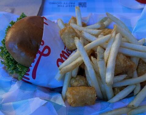 The choices are very simple: you can choose between a sin gle or double patty or a chicken sandwich. The toppings consist of tomato,pickles,onion, and lettuce to keep it short.