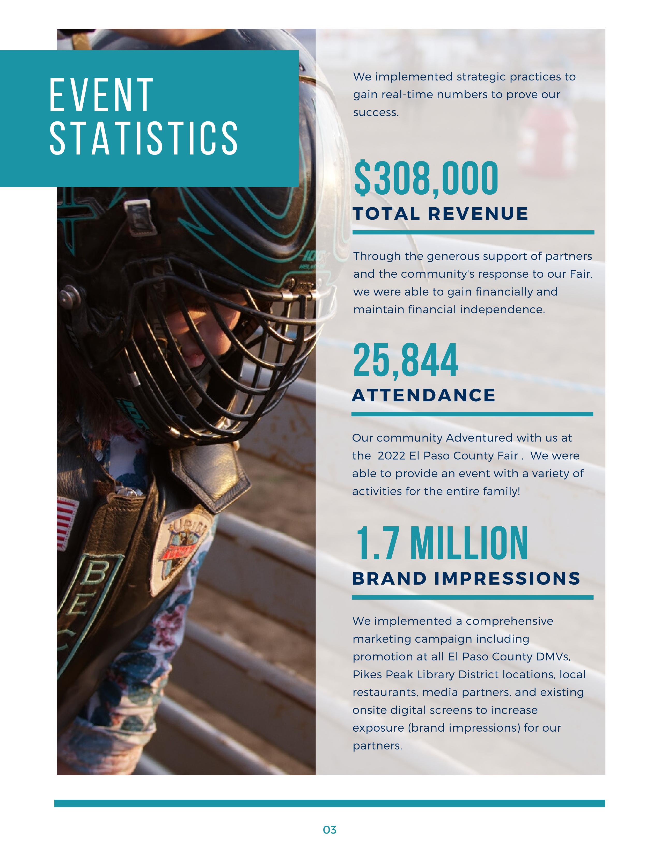2022 El Paso County Fair Partner Summary Report | The 117th Annual El Paso County Fair has many wins to boast and those successes are a result of the generous and intentional support from the El Paso County Commissioners, executive leadership, staff, volunteers, and our community partners.