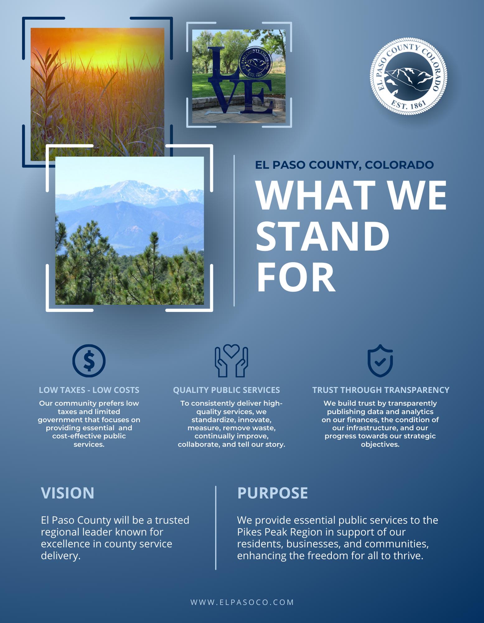 El Paso County is proud to be a transparent and accountable government. One of the County’s core values, as stated in the County’s Strategic Plan, is “We are open, honest, and respectful in our work and communication. We build trust by transparently publishing data and analytics on our finances, the condition of our infrastructure, and our progress toward our strategic objectives.”