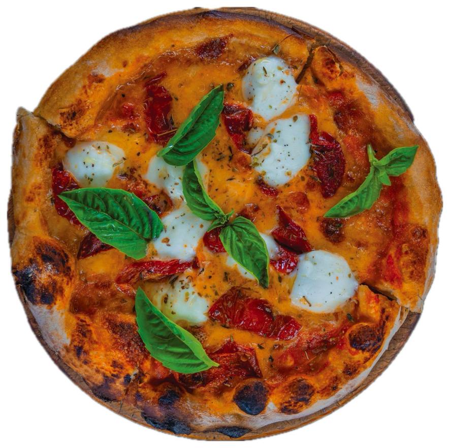 Bacon, mozzarella, curd, mushrooms, aubergine, olive, fresh tomato and basil.