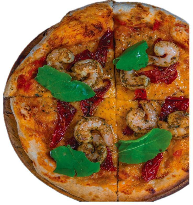 Pesto shrimp, mozzarella, cherry and arugula.