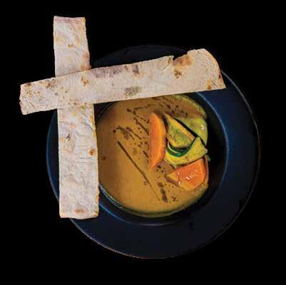 Pesto, croutones de berejena, tomate cherry, rúgula y cuajada fresca. Pesto, eggplant croutons, cherry tomatoes, arugula, and fresh curd.