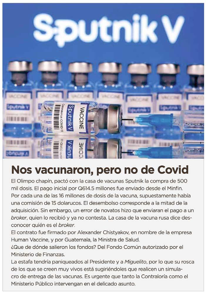 El 2 de mayo de 2021, elPeladero publicó la noticia relacionada a que el gobierno pactó por medio de un contrato opaco sin beneficios para el país por medio de una empresa intermediaria, la compra de vacunas rusas Sputnik V, por las cuales dieron un adelanto de Q614.5 millones.