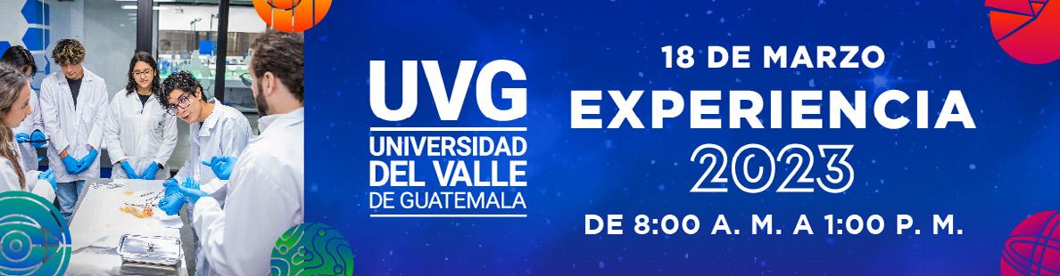 El próximo sábado 18 de marzo será la Experiencia 2023, en el Campus Central de Universidad del Valle de Guatemala (UVG). La Experiencia 2023 se efectuará en el Centro de Innovación y Tecnología (CIT-UVG), y en ella se realizarán actividades enfocadas en: Ciencias, Ingeniería, Educación, Creatividad y Negocios. Todas estas actividades te ayudarán a decidir tu carrera universitaria y así, desarrollar tus habilidades gracias a oportunidades de becas y ayudas financieras, laboratorios especializados, clubes, agrupaciones y asociaciones, y la posibilidad de intercambios y viajes académicos.