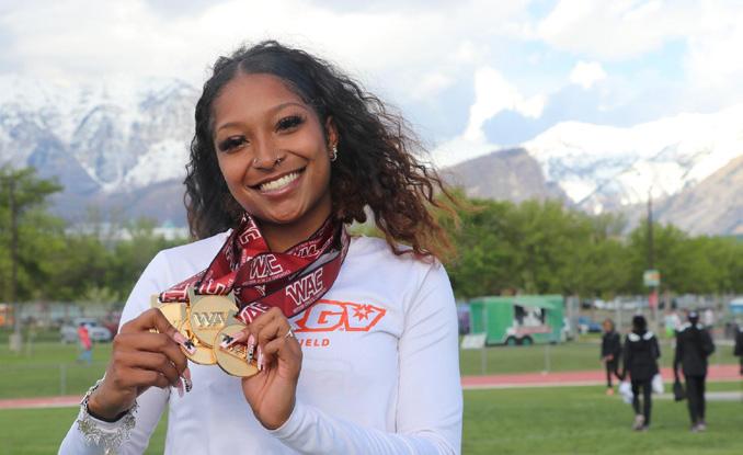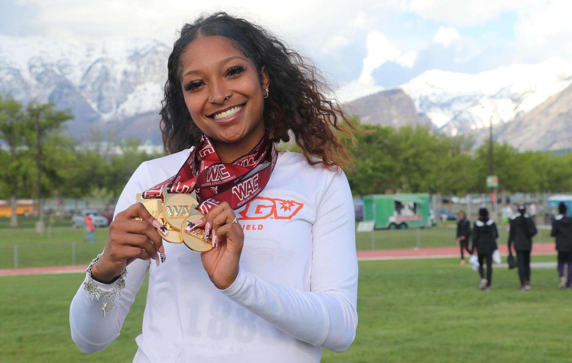 After her dominant performance at the Western Athletic Conference (WAC) Outdoor Championships May 9-11 in Orem, Utah, Adkins is a “threat” no more. She is undeniable.