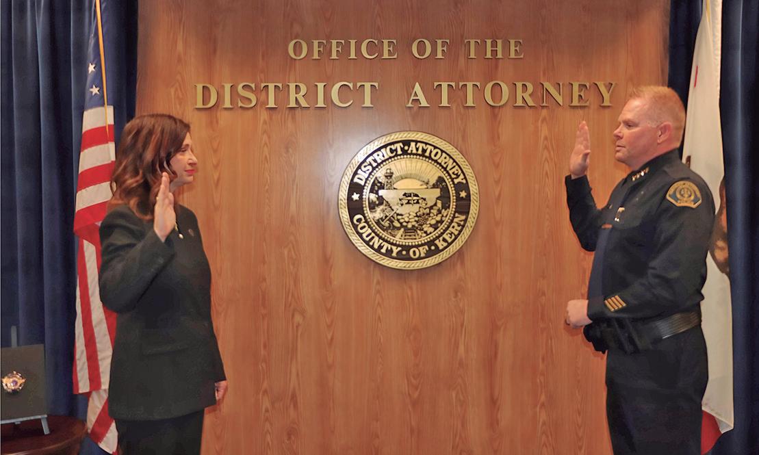 La fiscal de distrito del condado de Kern, Cynthia Zimmer, oficia el juramento del cargo a Randall Meyer como Jefe de Investigaciones durante la ceremonia de juramentación el lunes pasado. Foto: Cortesia de KCDA