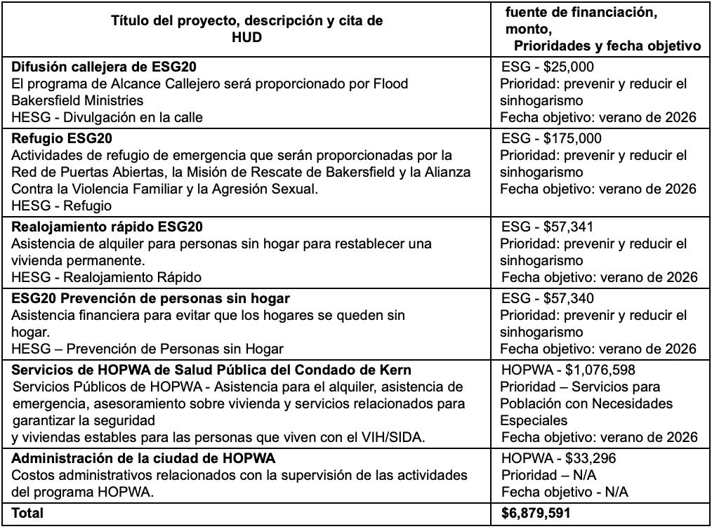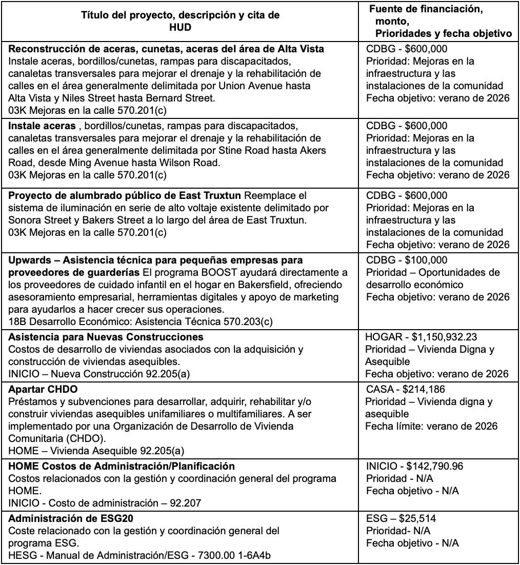 La Casa Comunitaria de Central Park y las Cámaras del Concejo Municipal son accesibles para personas con discapacidades. Las personas discapacitadas que necesiten asistencia especial para asistir o participar en las reuniones anteriores pueden solicitar asistencia en el Departamento de Desarrollo Económico y Comunitario, 1600 Truxtun Ave 3rd Floor, Bakersfield, California, 93301 o llamando al (661) 326-3765. Para servicios TTY, llame a California Relay Services al 711. Se hará todo lo posible para acomodar razonablemente a las personas con discapacidades y a las personas que hablan un idioma distinto al inglés, haciendo que los materiales de la reunión estén disponibles en formatos alternativos. Las solicitudes de asistencia deben hacerse con al menos cinco (5) días hábiles de anticipación al (661) 326-3765. A continuación se enumera una descripción de las actividades propuestas incluidas en el Borrador del Plan de Acción para el Año Fiscal 2025-26: Borrador del Plan de Acción del Año Fiscal 2025/26 de la Ciudad de Bakersfield