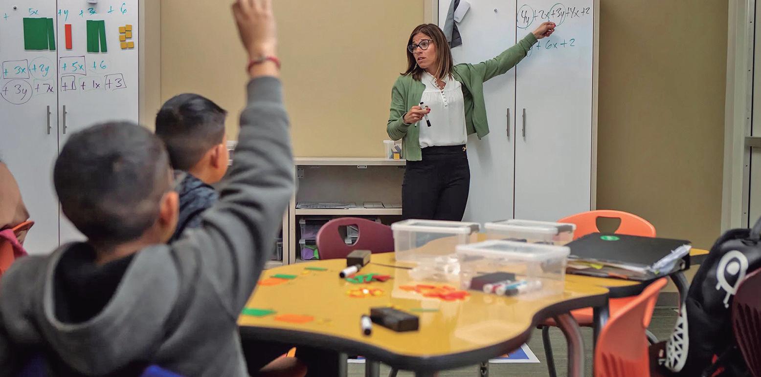 Durante un programa extracurricular reciente, alrededor de una docena de estudiantes de sexto grado, muchos de ellos aprendices de inglés, recitaron fórmulas algebraicas con el maestro y respondieron preguntas sobre las ecuaciones x e y.