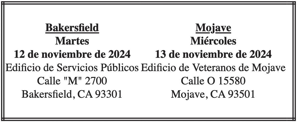 Las personas discapacitadas que necesiten asistencia especial para asistir o participar en una reunión del Departamento de Planificación y Recursos Naturales del Condado de Kern pueden solicitar asistencia en: Departamento de Planificación y Recursos Naturales del Condado de Kern - División de Desarrollo Comunitario