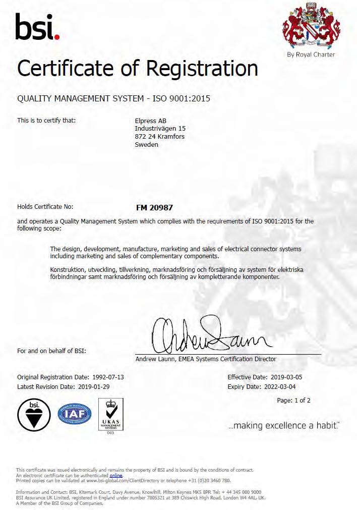对我们而言,质量意味着始终努力成为业 内优秀者。我们深信知识是实现产品较高 质量的重要因素,因此我们坚持不懈地改 善我们的产品、方法及我们自身。自1992年 以来,我们的质量工作已使Elpress获得了 ISO9001认证。