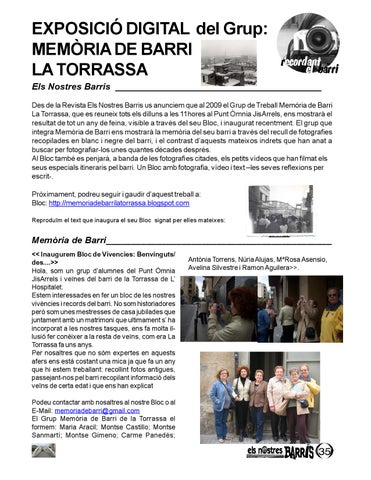 EXPOSICIÓ DIGITAL del Grup: MEMÒRIA DE BARRI LA TORRASSA Els Nostres Barris _________________________________________ Des de la Revista Els Nostres Barris us anunciem que al 2009 el Grup de Treball Memòria de Barri La Torrassa, que es reuneix tots els dilluns a les 11hores al Punt Òmnia JisArrels, ens mostrarà el resultat de tot un any de feina, visible a través del seu Bloc, i inaugurat recentment. El grup que integra Memòria de Barri ens mostrarà la memòria del seu barri a través del recull de fotografies recopilades en blanc i negre del barri, i el contrast d’aquests mateixos indrets que han anat a buscar per fotografiar-los unes quantes dècades després. Al Bloc també es penjarà, a banda de les fotografíes citades, els petits vídeos que han filmat els seus especials itineraris pel barri. Un Bloc amb fotografia, vídeo i text –les seves reflexions per escrit-. Pròximament, podreu seguir i gaudir d’aquest treball a: Bloc: http://memoriadebarrilatorrassa.blogspot.com Reproduïm el text que inaugura el seu Bloc signat per elles mateixes: