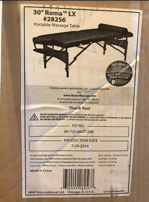PORTABLE Massage Table. NEW in box, Master Massage 30” Roma LX, 30 “ x 84”, 32.5 lbs., head rest and book shelf. $120. 760-9203975. 51 (4)