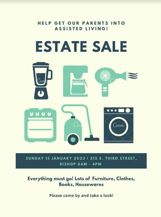 ESTATE SALE! Help get our parents into assisted living… Sunday 15 January 2023 8AM-4PM • 215 South Third Street, Bishop • Everything must go! Lots of Furniture, Clothes, Books, Housewares. 02