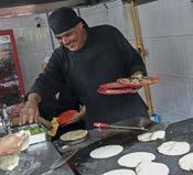 La otra mitad está llena de clientes de pie sosteniendo platos de plástico y sirviendo salsa, y el asistente que extiende las rondas de masa de tortilla constantemente.