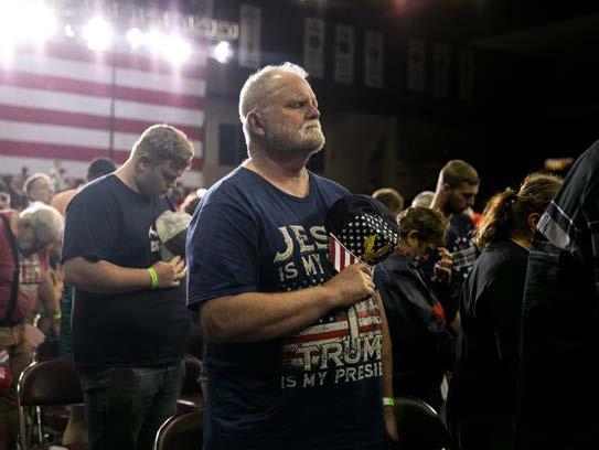 Apoyo de los pastores locales Los mítines de Trump siempre han sido una mezcla entre un concierto de rock y una carpa de avivamiento. Cuando Trump empezó a cerrar sus mítines con música ambiental, muchos la relacionaron con temas musicales similares del