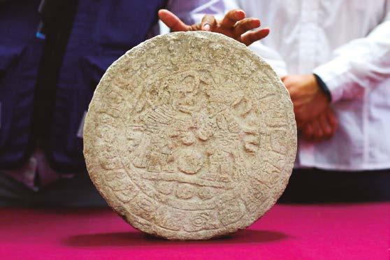The circular piece, measuring just over 32 centimeters (12.6 inches) in diameter and weighing 40 kilograms (88 pounds), displays hieroglyphic writing surrounding two players standing next to a ball, according to a statement from Mexico’s National Institute of Anthropology and History (INAH).