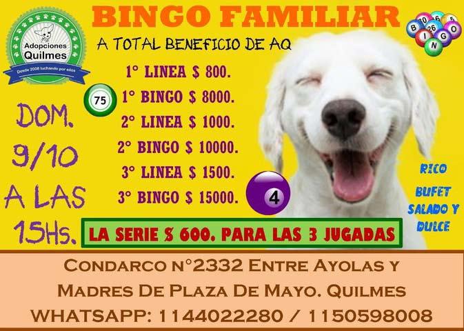 Además, el domigo por la tarde, a partir de las 15, está previstó un bingo familiar a beneficio de Adopciones Quilmes en la Sociedad de Fomento 11 de Agosto de Quilmes Oeste.