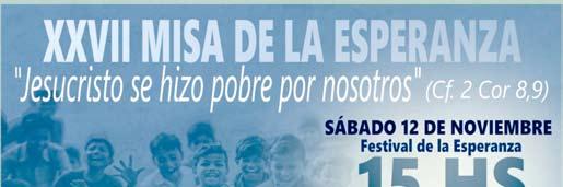 El sábado, a las 19, la Diócesis de Quilmes celebrará la XXVII Misa de la Esperanza con el lema “Jesucristo se hizo pobre por nosotros” junto con la VI Jornada Mundial de los Pobres propuesta por el Papa Francisco. Será en el Cruce Varela, con la presencia del obispo Carlos Tissera, y se transmitirá en vivo por Youtube.com/ DiocesisQuilmesOficial. Mientras que a las 15 se realizará el Festival de la Esperanza.