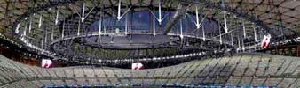 El techo tiene un diámetro de 307 metros y está hecho de una membrana de cable que tiene un patrón que recrea elementos en forma de diamante.