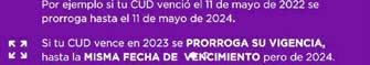 De este modo, aquellos que tengan CUD con vencimiento en 2022, prorrogan su vigencia hasta la misma fecha de vencimiento que figura en el certificado pero de 2024. Por ejemplo, si un CUD venció el 11 de mayo de 2022 es válido hasta el 11 de mayo de 2024. En el caso de los CUD que vencen en 2023, se prorroga su vigencia por un año, hasta la misma fecha de vencimiento pero de 2024. En tanto, quienes tengan CUD que vencieron en 2021 tendrán que tramitar la renovación.